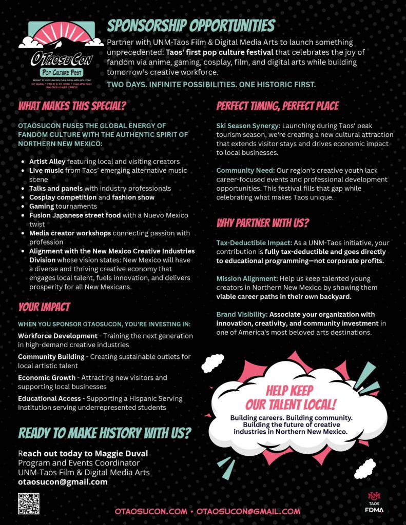 In addition to community participation and support, the event will be designed and produced by UNM-TAOS students, fostering workforce skills in creative visioning, event design, and production. OTaosuCon aims to create an inclusive cultural event for and by the people of Taos, especially young people, providing them with a space to express their voices and artistic vision while inspiring future student enrollment in our programs.